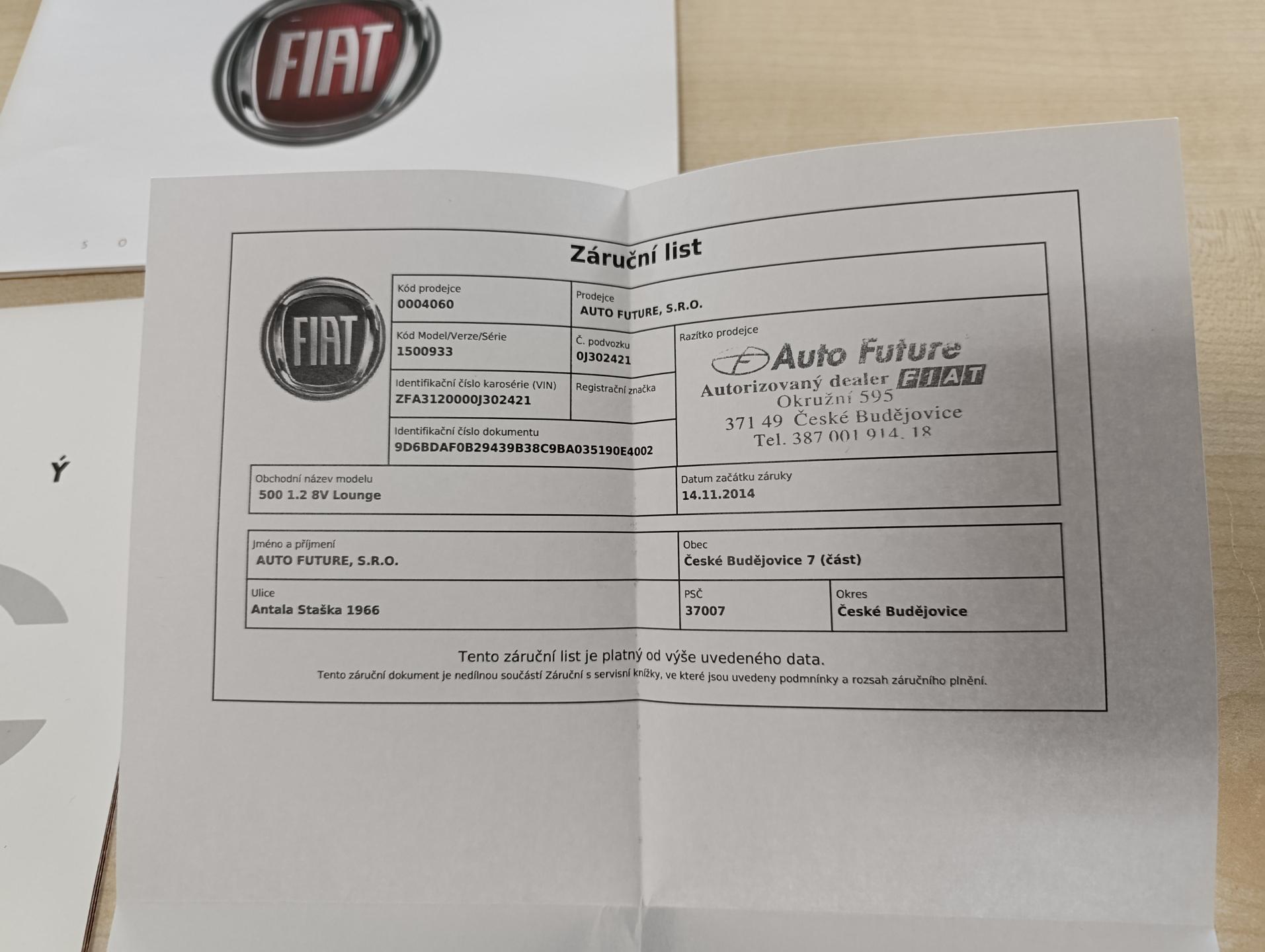| Poznámka | koupeno v CZ, servisní knížka, ihned k odběru, vozidlo nabízí autorizovaný dealer Fiat, koupeno jako nové v ČR na našem dealerství, 2x klíč, barva Žlutá Sole, kontakt na prodejce: Adam Kantor, tel. 737 221 476, Údaje obsažené v této kartě mají informativní charakter. Nejedná se o návrh na uzavření smlouvy (nabídku) dle § 1731 zákona č. 89/2012 Sb., občanský zákoník, ale o nezávaznou nabídku |